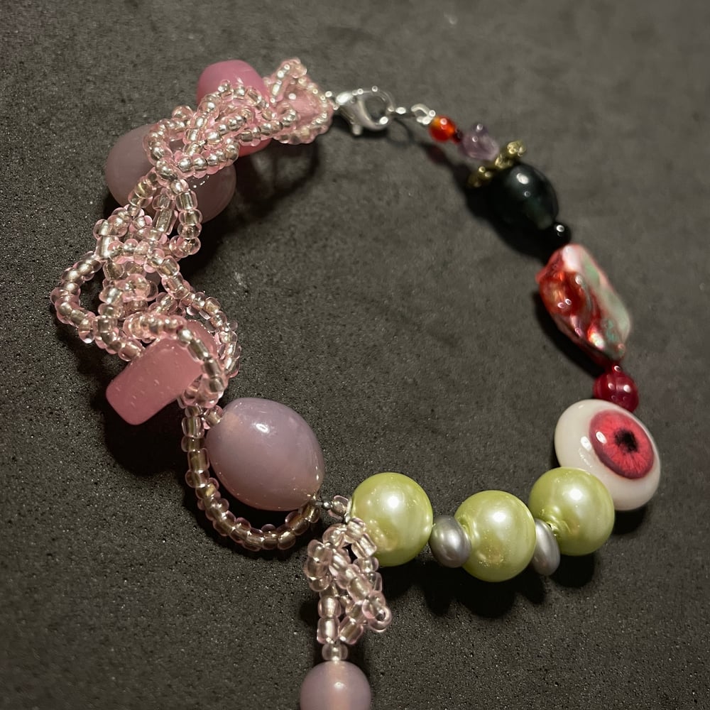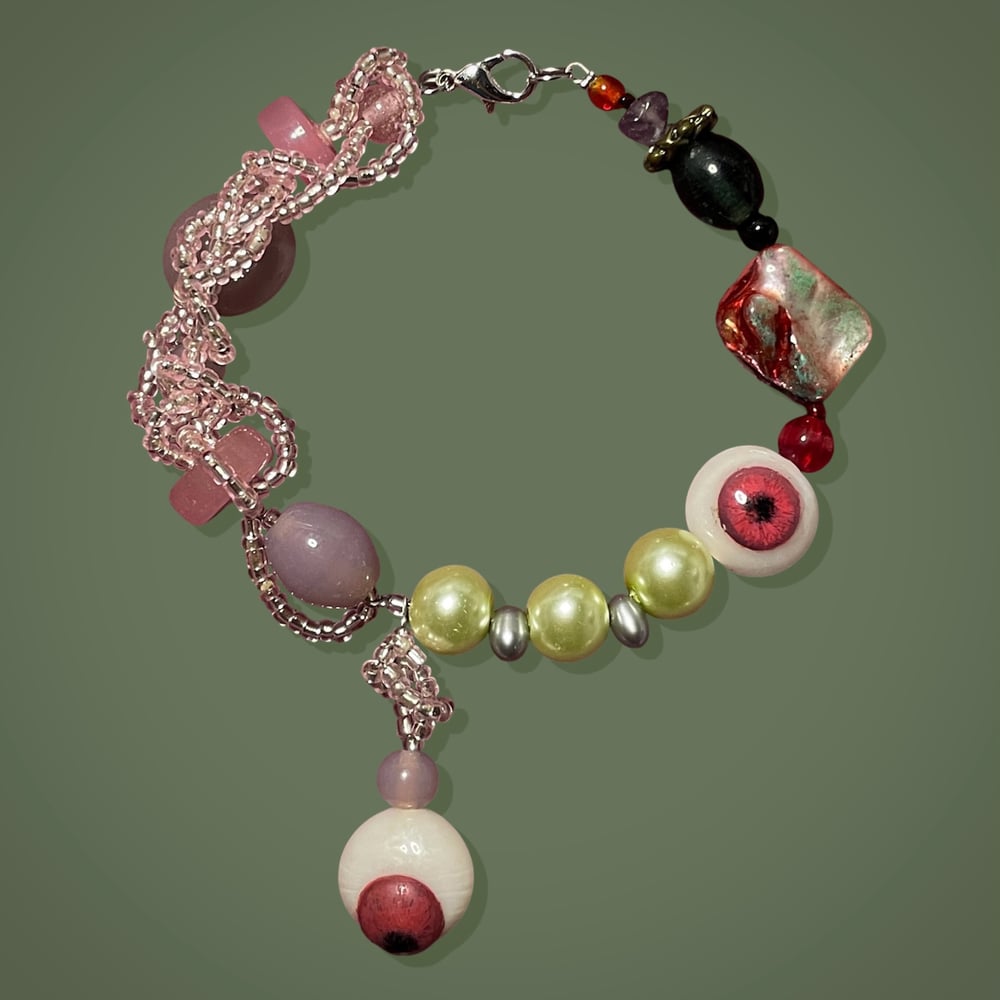 *ੈ✩‧₊• made-to-order bracelet featuring glass, czech glass, amethyst, shell, + lampwork beads. eyeball & mould-like beads hand-painted by me (sealed with resin). stainless steel findings, metal lobster clasp.