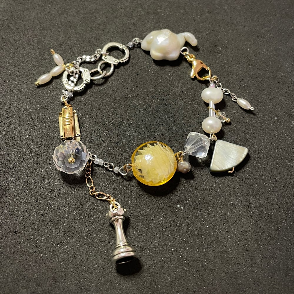 *ੈ✩‧₊• 1-of-1 bracelet featuring glass, lampwork, + freshwater pearl beads. stainless steel & 18k gold plated stainless steel findings, 24k gold plated stainless steel clasp, metal components.
