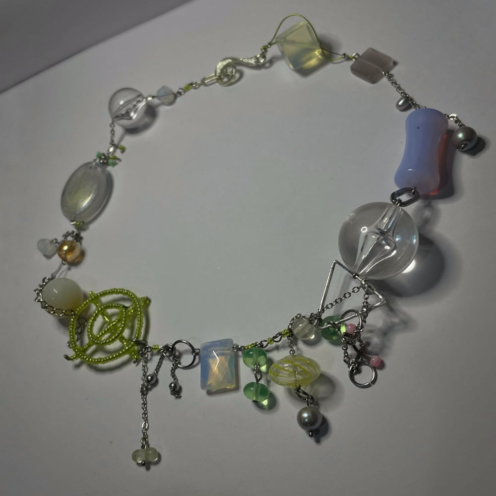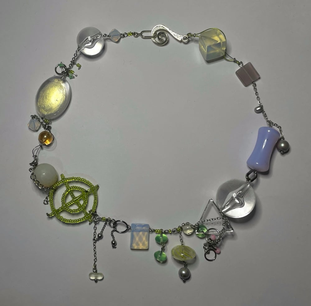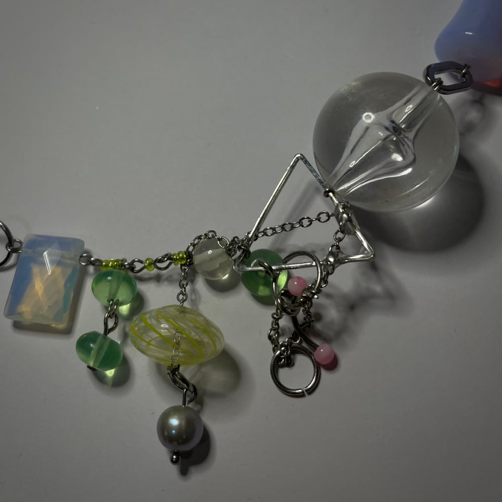 *ੈ✩‧₊• 1-of-1 necklace featuring freshwater pearl, glass, czech glass, lampwork, acrylic & glass seed beads. stainless steel findings, metal clasp, triangle frame & chain.