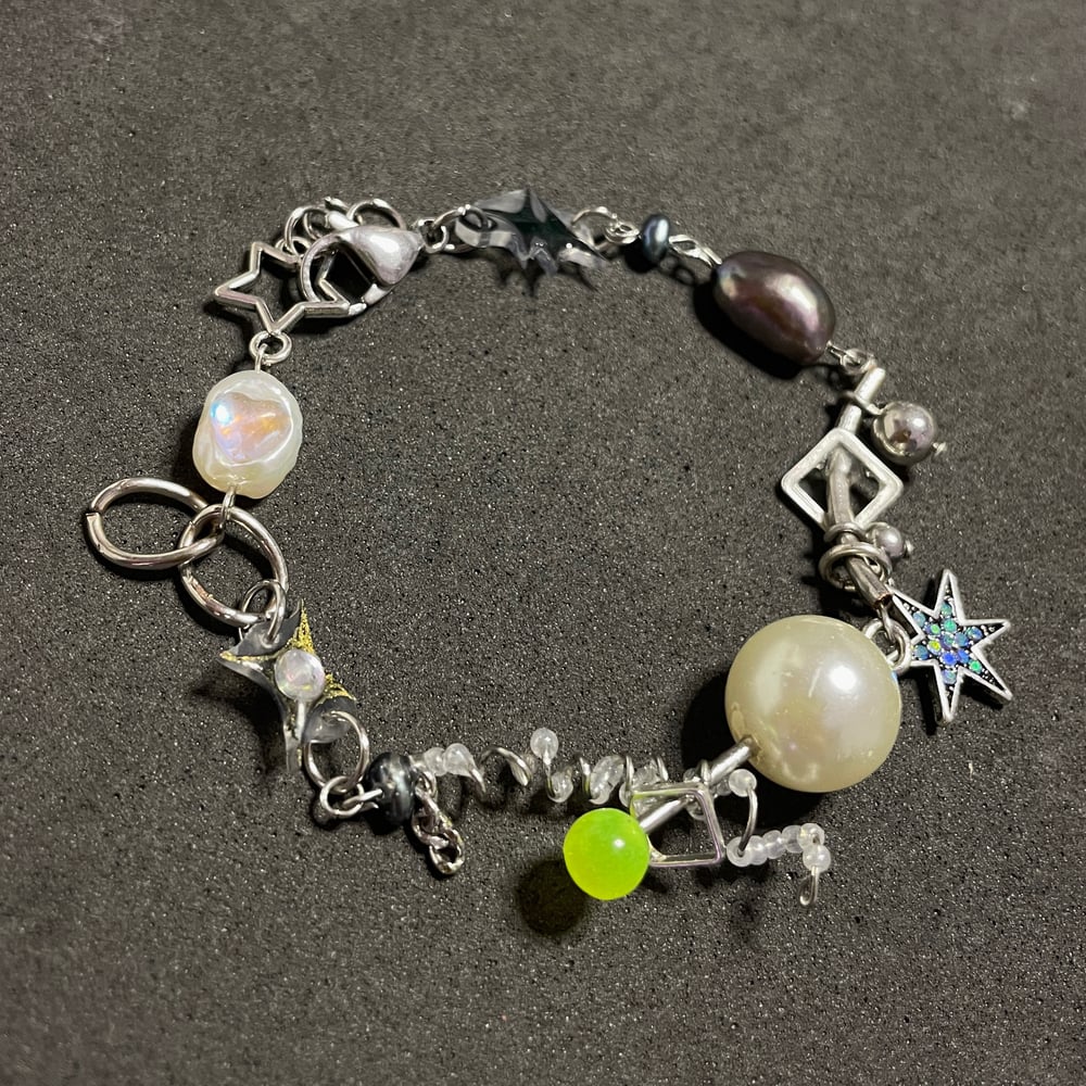 *ੈ✩‧₊• 1-of-1 bracelet featuring glass + freshwater pearl beads, handmade shrink plastic connectors (sealed with resin). stainless steel findings & clasp, metal beads, charms, & chain components.