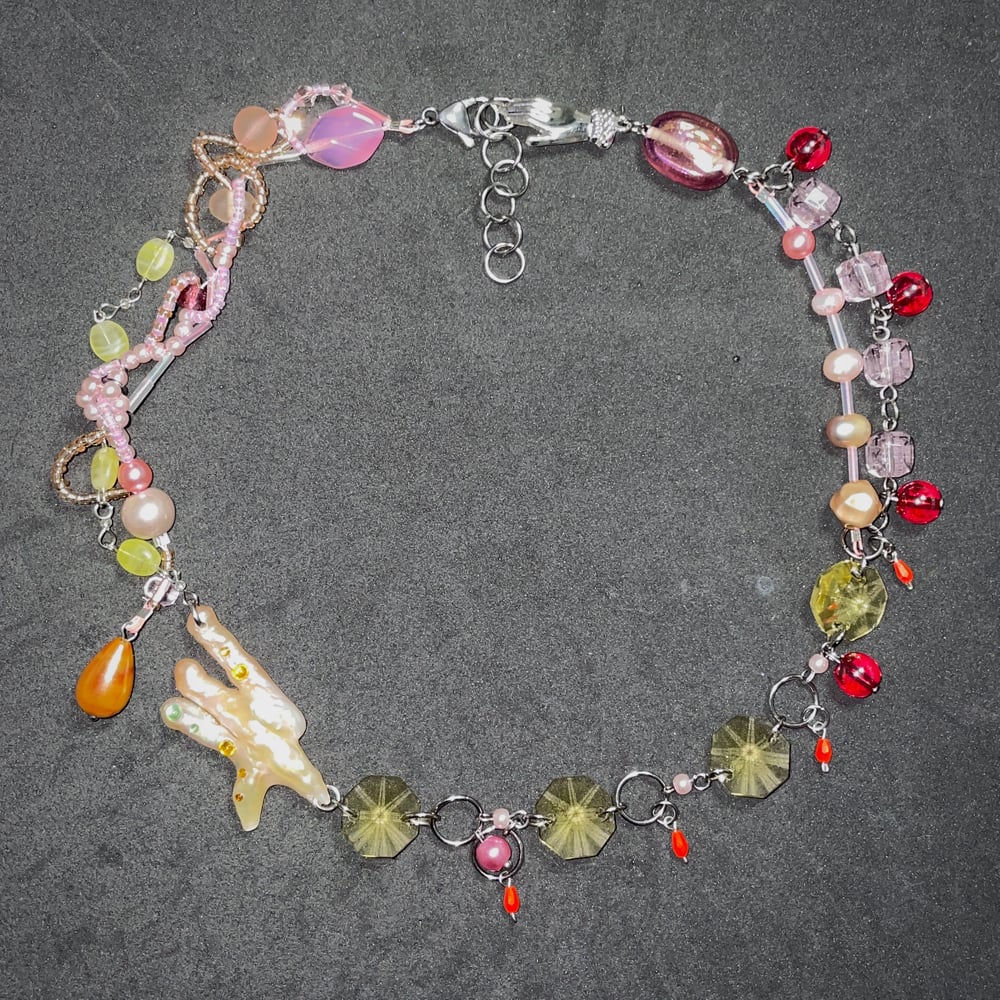 *ੈ✩‧₊• 1-of-1 necklace featuring glass, lampwork, czech glass + freshwater pearl beads. stainless steel findings, metal hand connector charm.