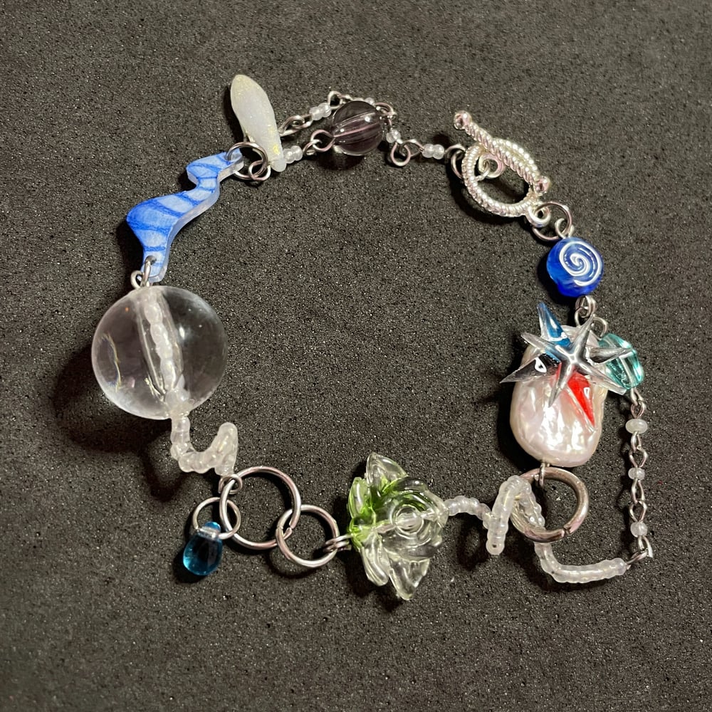 *ੈ✩‧₊• 1-of-1 bracelet featuring glass , acrylic, czech glass, + freshwater pearl beads, handmade shrink plastic components (sealed with resin). stainless steel findings, metal clasp.